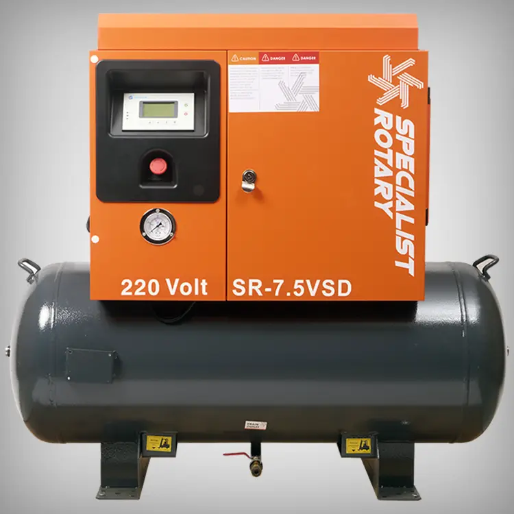 The SR-7.5VSD, the robust sibling of the SR-5.5VSD. This powerhouse operates at 220V and boasts a 7.5HP variable speed drive system, delivering exceptional performance. Paired with a substantial 200L tank, it offers extended air supply for your needs.